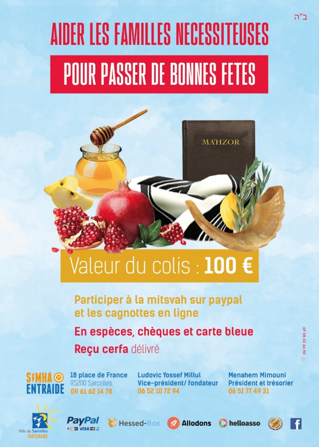 Pour cela la campagne de tichri 5781 est lancée nous attendons plus de 50 familles et nous devons y répondre afin de les combler au maximum en viande , en laitages , légumes , fruits , pâtes , riz , farine , sucre , œuf, huile , gâteaux , boissons , salades , hallot .
