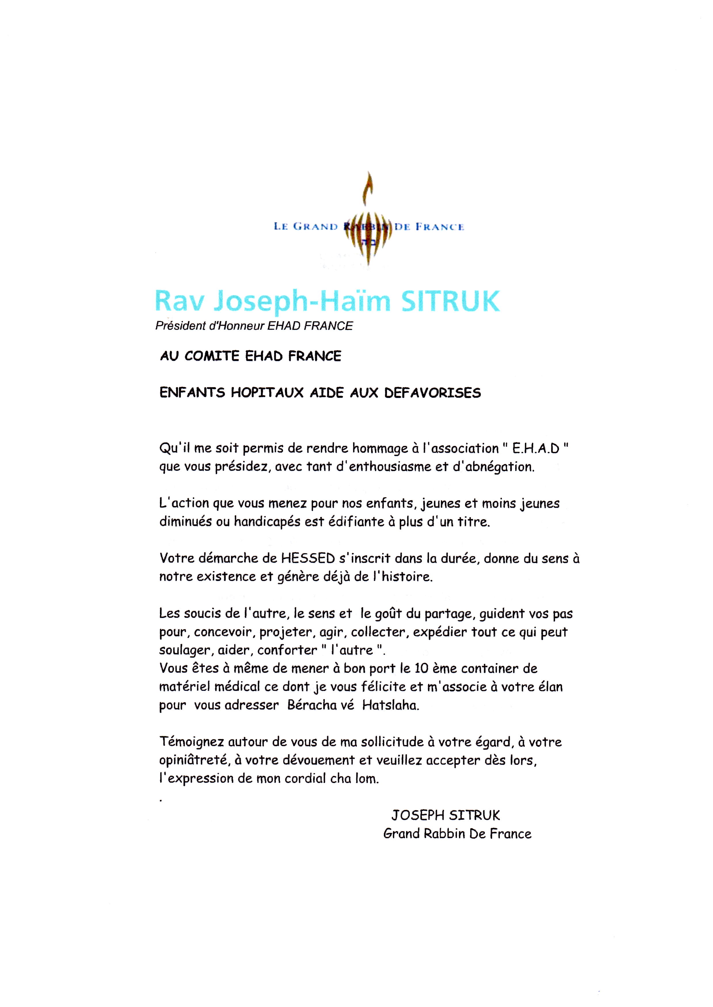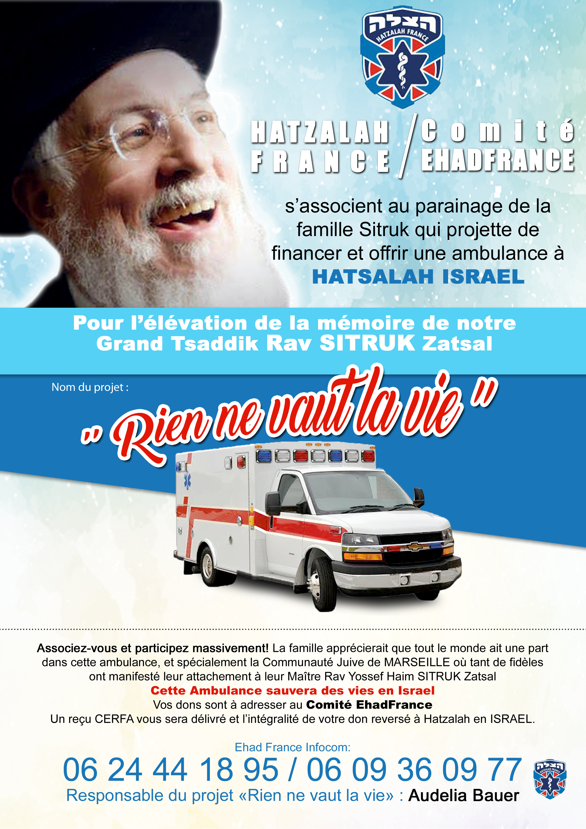 Participation à l'achat d'une ambulance au profit de l'association HATSALAH JERUSALEM à la mémoire du TSADIK Rav Yossef Haïm Sitruk Zatsal décédé le 22 Elloul 5776 | 25 Septembre 2016.